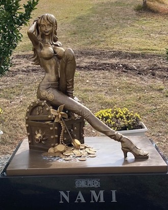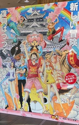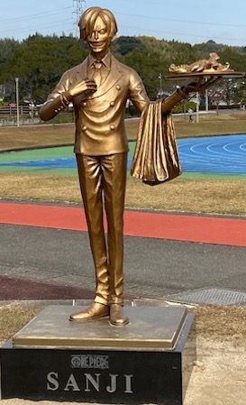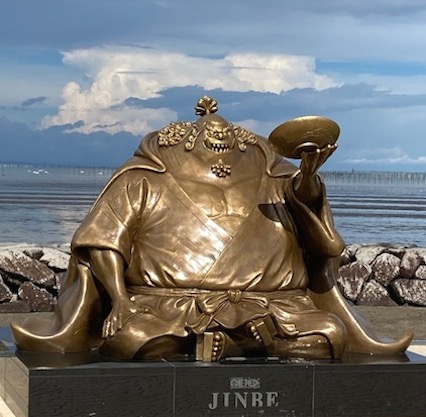 熊本にはONE PIECE 熊本復興プロジェクトというのがあって、2018年には復興の象徴として、ルフィ像を熊本県庁プロムナードに設置、2019年度からは、〈麦わらの一味「ヒノ国」復興編〉として、県内9市町村に麦わらの一味の仲間の像を4年かけて設置している。