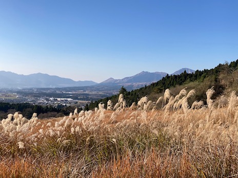 低山だけど見晴らしが良く、北にわれらがネコちゃん(根子岳)や高岳東峰、奥にくじゅう連山、東には祖母山がきれいに見えるし、西に広がる南郷谷にススキが晩秋の風情でいい感じd(@_*)。