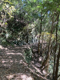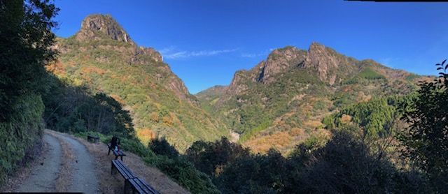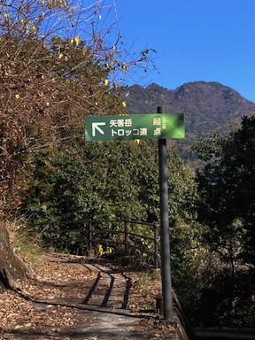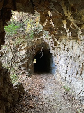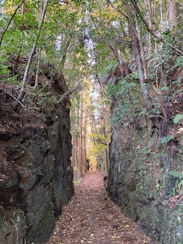 ほぼ平坦で枯れ葉が敷き詰められた気持ちのいい道が続き、途中の見晴らしのいいところにはベンチを設えた休憩場所もあるし、岩を穿った手彫りのトンネルがあったり、気軽に散策するにはなかなかいいコースでした。しかし、よくこんな山肌にトロッコを走らせる軌道を作っていたもんですね。その営為を想うと昔の繁栄を想像します。